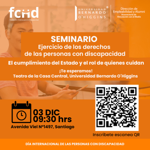 La Fundación Chilena para la Discapacidad y la Universidad Bernardo O’Higgins, tienen el agrado de invitarte al seminario “Ejercicio de los derechos de las personas con discapacidad: el cumplimiento del Estado y el rol de quienes cuidan”.